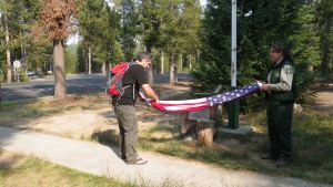 Eddie & Ranger Terra folding the U.S. flag, Newberry National Monument.