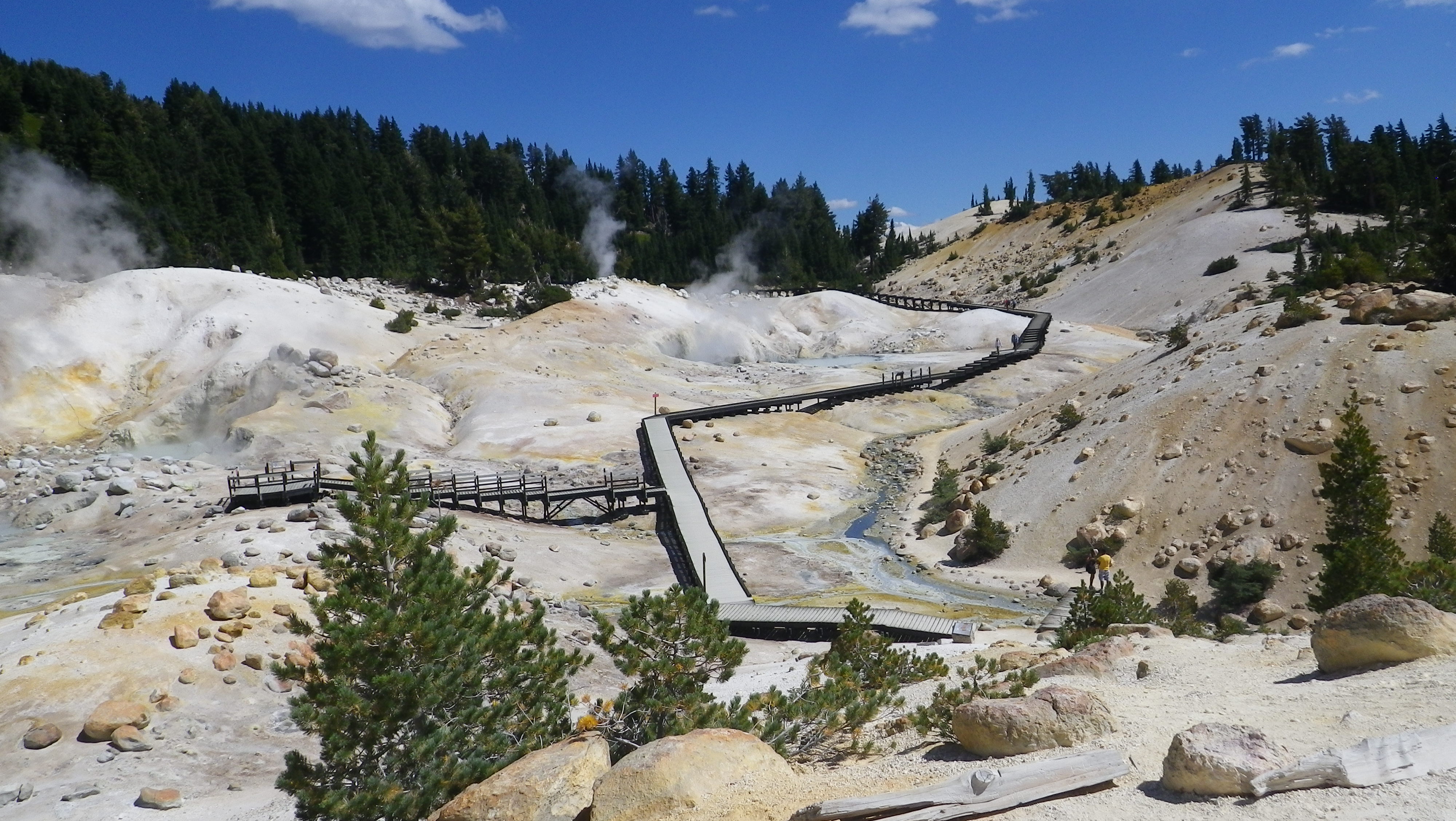 Our next ring of fire stop was Lassen Volanic National Park which erupted energetically between 1914 and 1921. The park had only recently re-opened after being evacuated due to forest fires and we drove through some of the damage (no stopping allowed). The trail up Lassen Peak was closed for trackwork to make it safer after a boy was killed by a rock-wall collapse in 2009 so we’ll have to do it next time. Instead we hiked into Bumpass Hell, (named after an early guide, Kendall Bumpass, who fell into a pool and burned his leg), an amazing thermal area with the hottest steam vent in the world that’s not actually in an erupting volcano (161 degrees C). There are lots of things named hell or devil in volcanic areas.