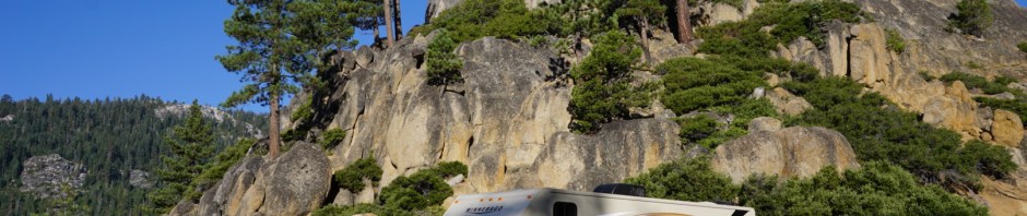 From Big Trees, despite warnings about narrow roads & tight bends, we headed along  state highway 4 up and over Ebbetts Pass which was a great drive through glacier sculpted granite country and volanic rock. It is not for vehicles over 25ft long though – we are 22ft long and quite tall and wide.